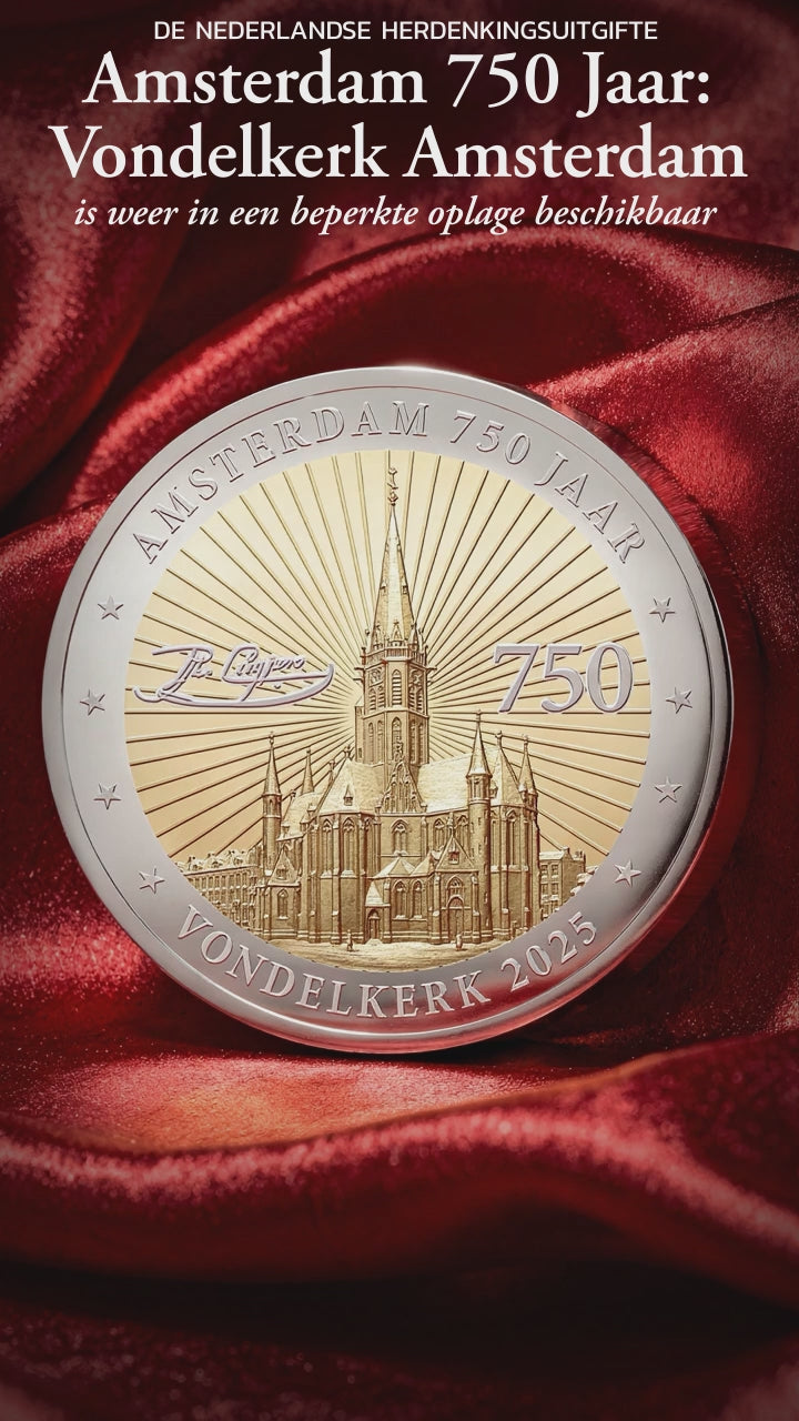 Door de recente brand is de belangstelling sterk toegenomen. Ondanks de al zeer beperkte oplage is het ons gelukt om een nieuwe voorraad te claimen. Met elke verkochte munt dragen wij € 7,50 extra bij aan het herstel van de Vondelkerk, de “Notre-Dame van Amsterdam”. Dit doen wij in officiële samenwerking met Stadsherstel Amsterdam.